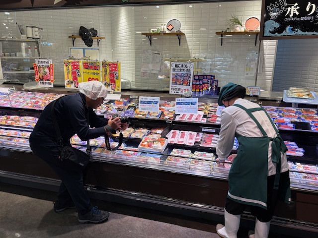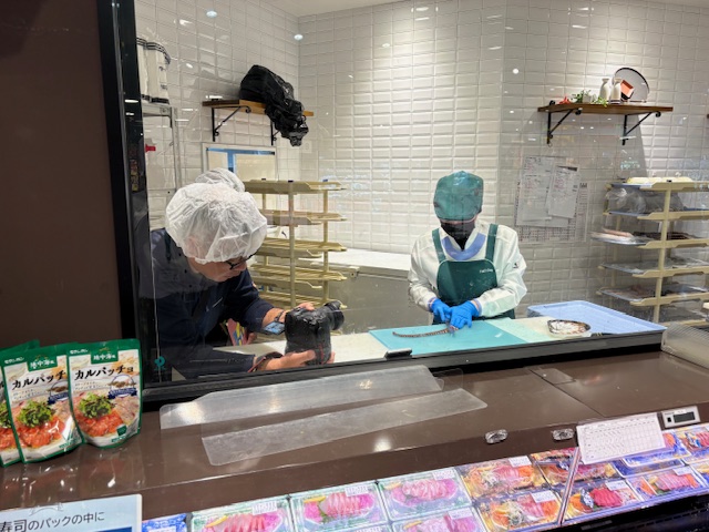 また、水産部の社員が刺身を切る様子や商品を売場に並べる姿など、普段の仕事の様子を