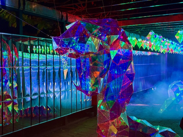これは来場者が持つ提灯の色に反応してご神木の色が変化する仕掛けがあります。例えば紫色の提灯を持って近づくと、ご神木も同じ紫色に輝きます。舞鶴公園には初めて行きましたが、他の園内も各所がライトアップされ、とてもきれいでした!それでは、今日はこの辺で!ハロハロ~